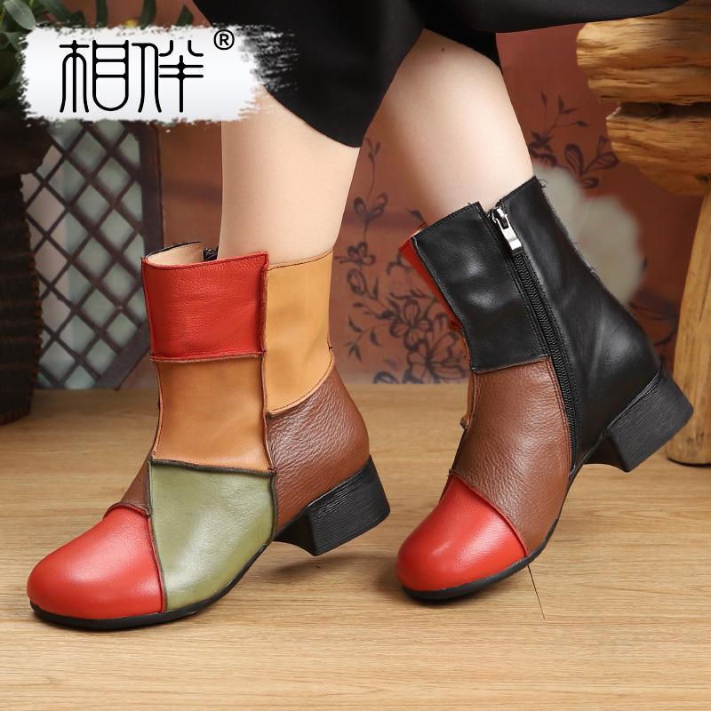 相伴真皮中筒女2025新款冬靴拼色复古风皮靴民族风新中式平跟女靴