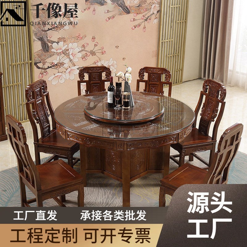 全实木圆形餐桌雕花橡木大圆桌家用饭桌10人中式仿古餐桌椅组合