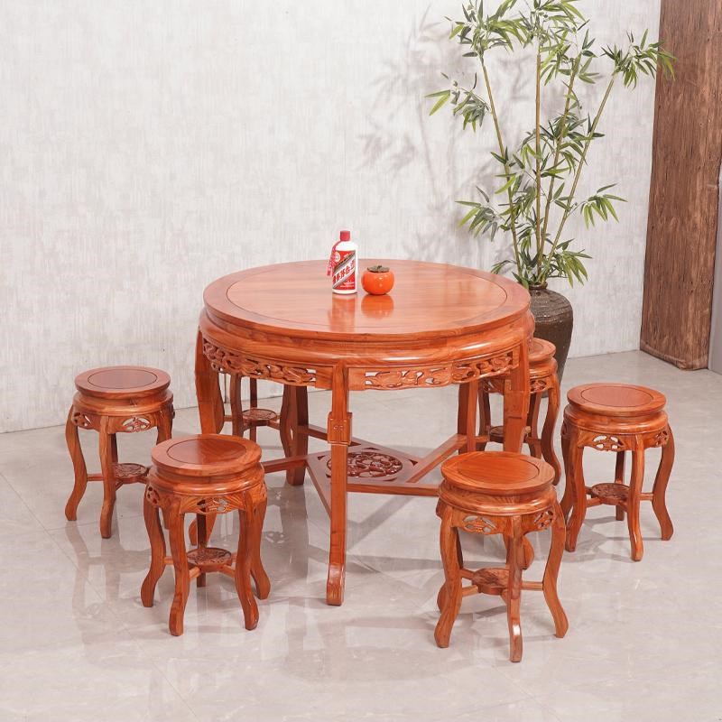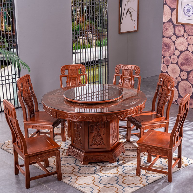 花梨木实木餐桌组合中式仿古雕花饭桌客厅家用大圆桌榫卯木质餐桌