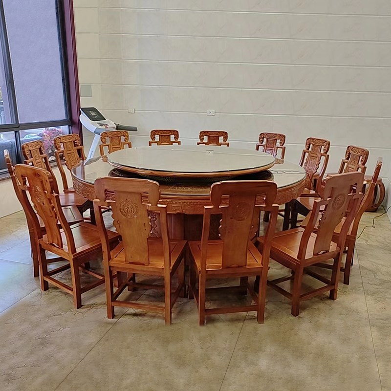 实木大圆桌带转盘10人酒店饭店餐馆电动圆桌新中式仿古餐桌椅组合