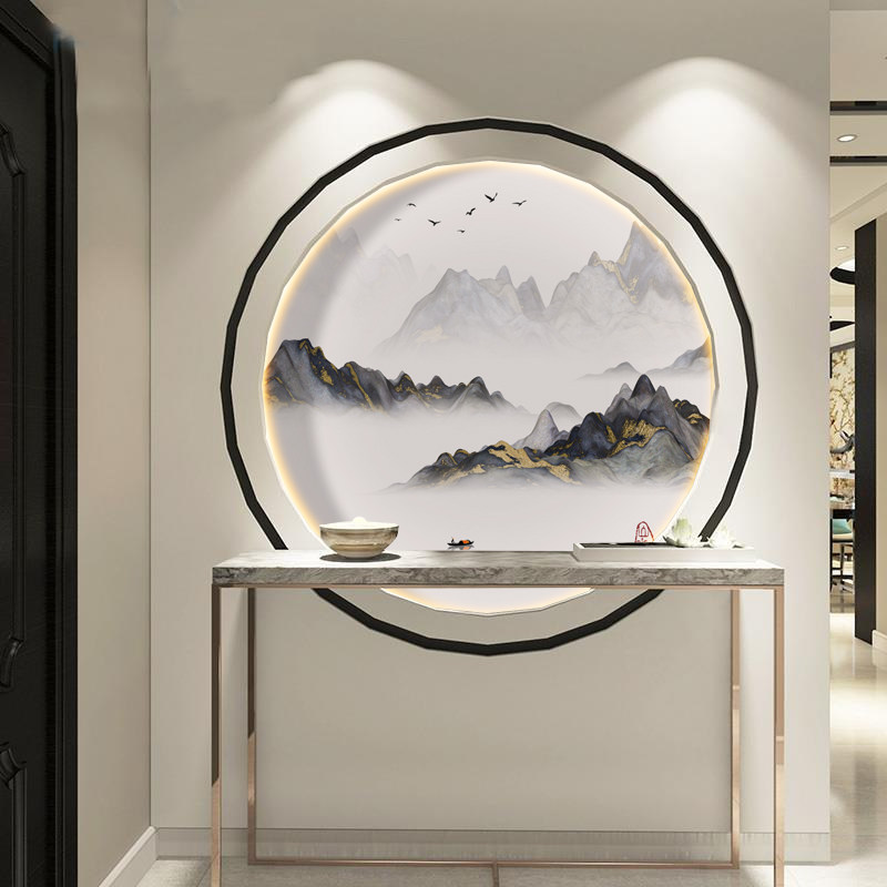 新中式手绘意境水墨中国风山水圆形背景墙壁纸无纺布墙纸定制3d
