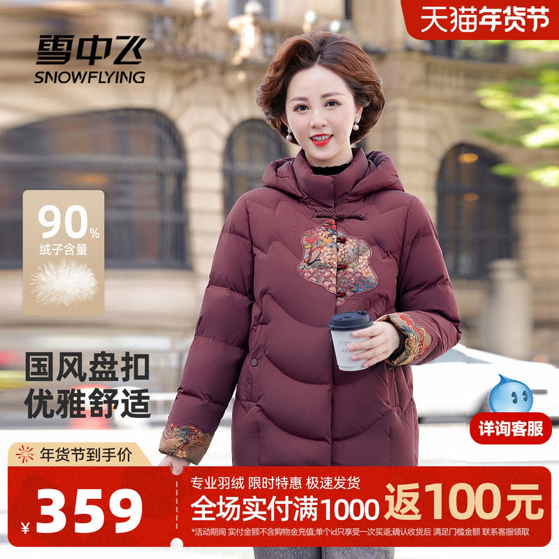 雪中飞2025冬新款羽绒服气质妈妈款中老年国风印花新中式简约保暖