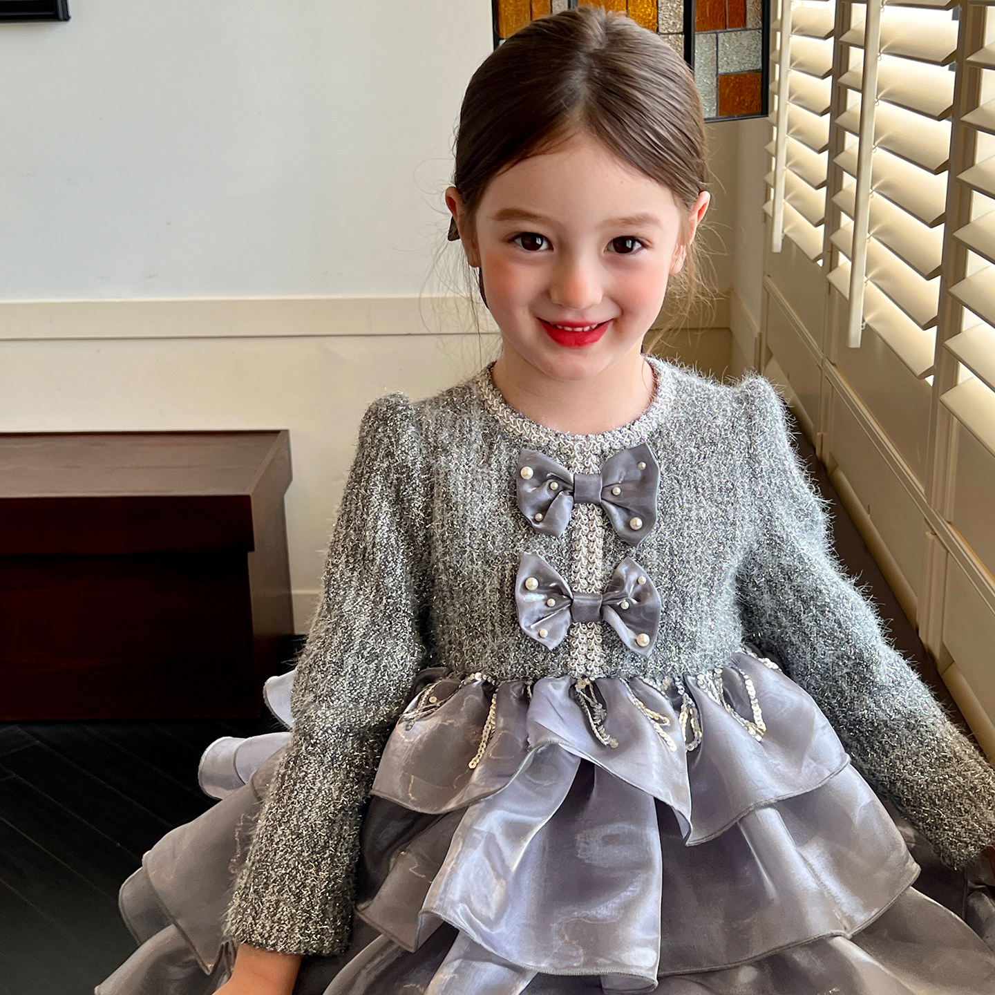 女童小香风连衣裙秋冬2025新款洋气女孩网纱拼接长袖公主蛋糕裙子