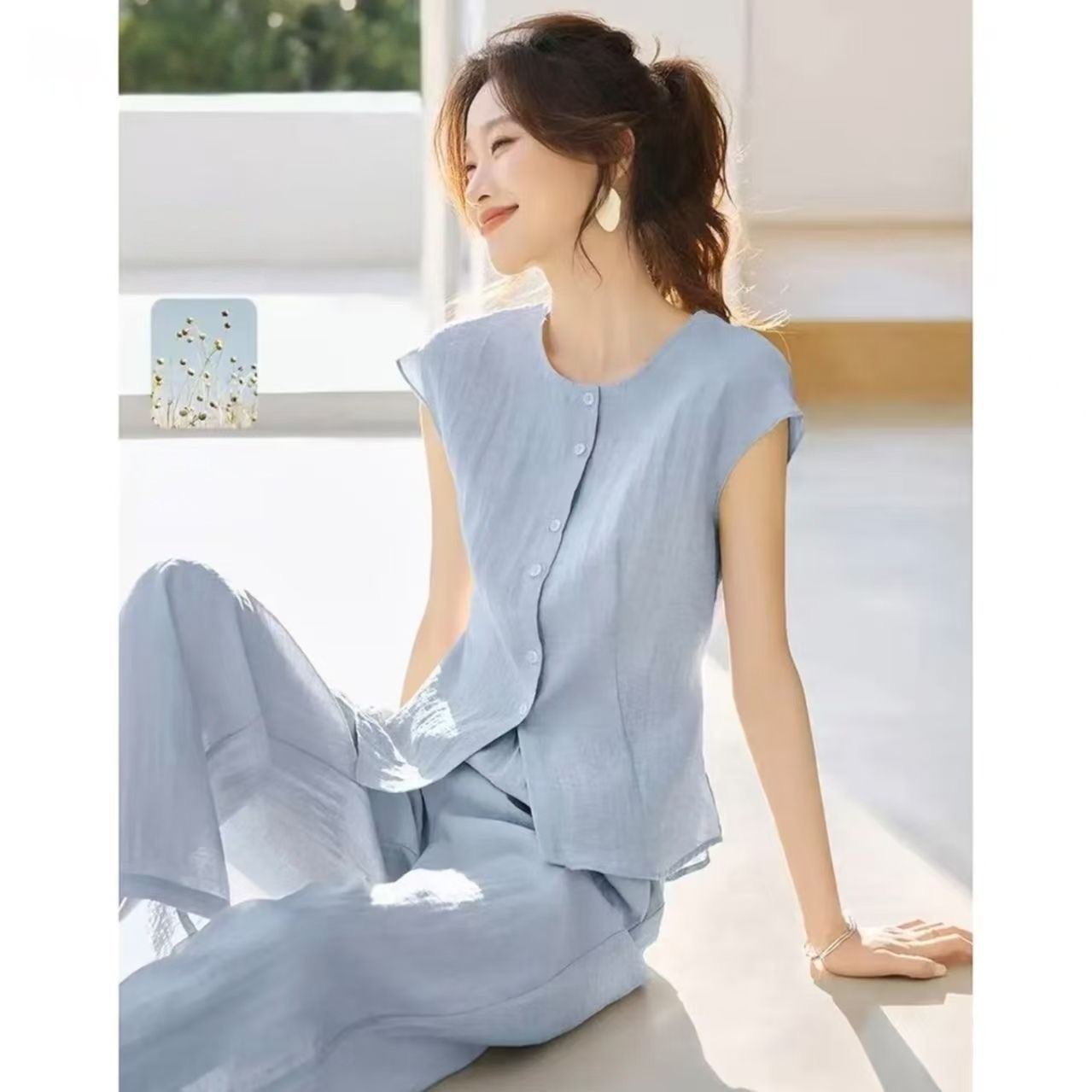 夏天套装女款2026新款蓝色上衣裤子两件套夏季时尚洋气棉麻妈妈装
