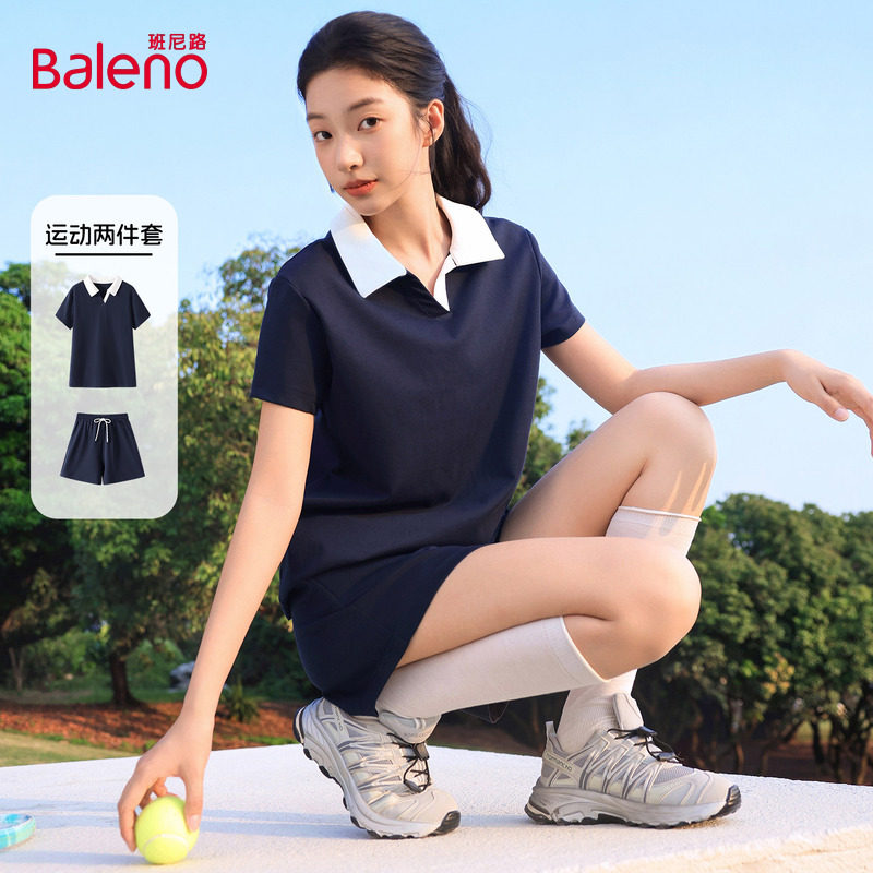 班尼路藏青色POLO领运动套装女款夏季新款短袖T恤高腰短裤一整套Q