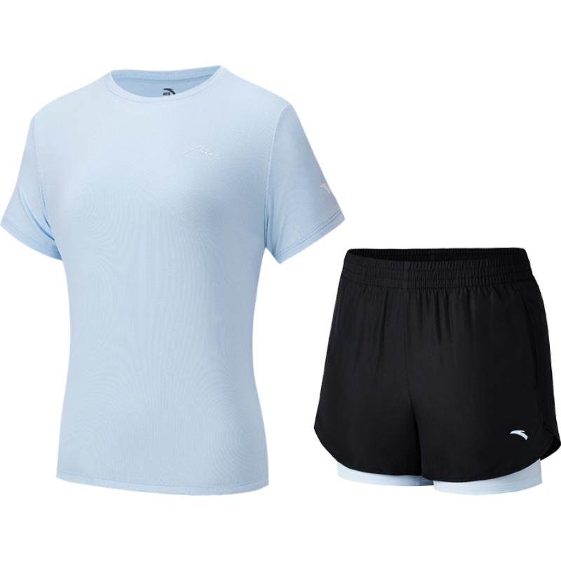 安踏蓝色运动套装女款速干健身衣服夏季透气羽毛球服跑步短袖短裤