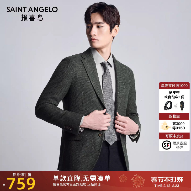报喜鸟秋季新款商务正装男士西装外套平驳领西服上衣休闲单西绿色