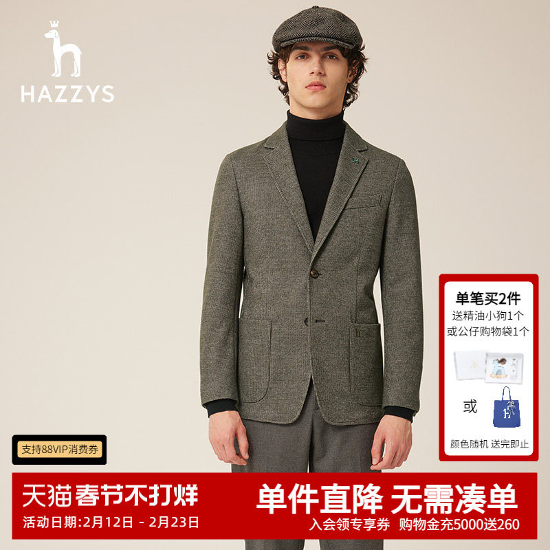 Hazzys哈吉斯秋冬新款男士西装千鸟格休闲保暖单西潮羊毛针织西服
