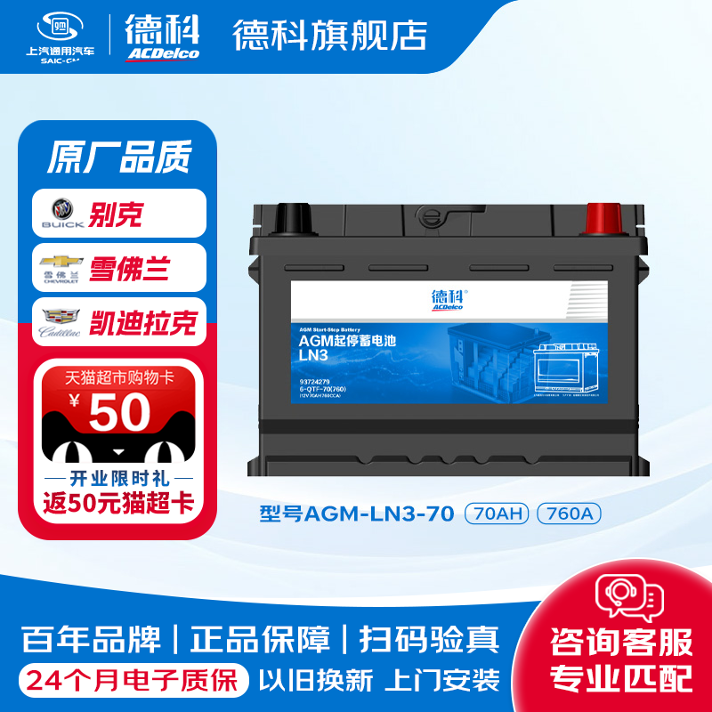 德科汽车电瓶启停蓄电池AGM系列AGM70适配别克英朗凯迪拉克XTS