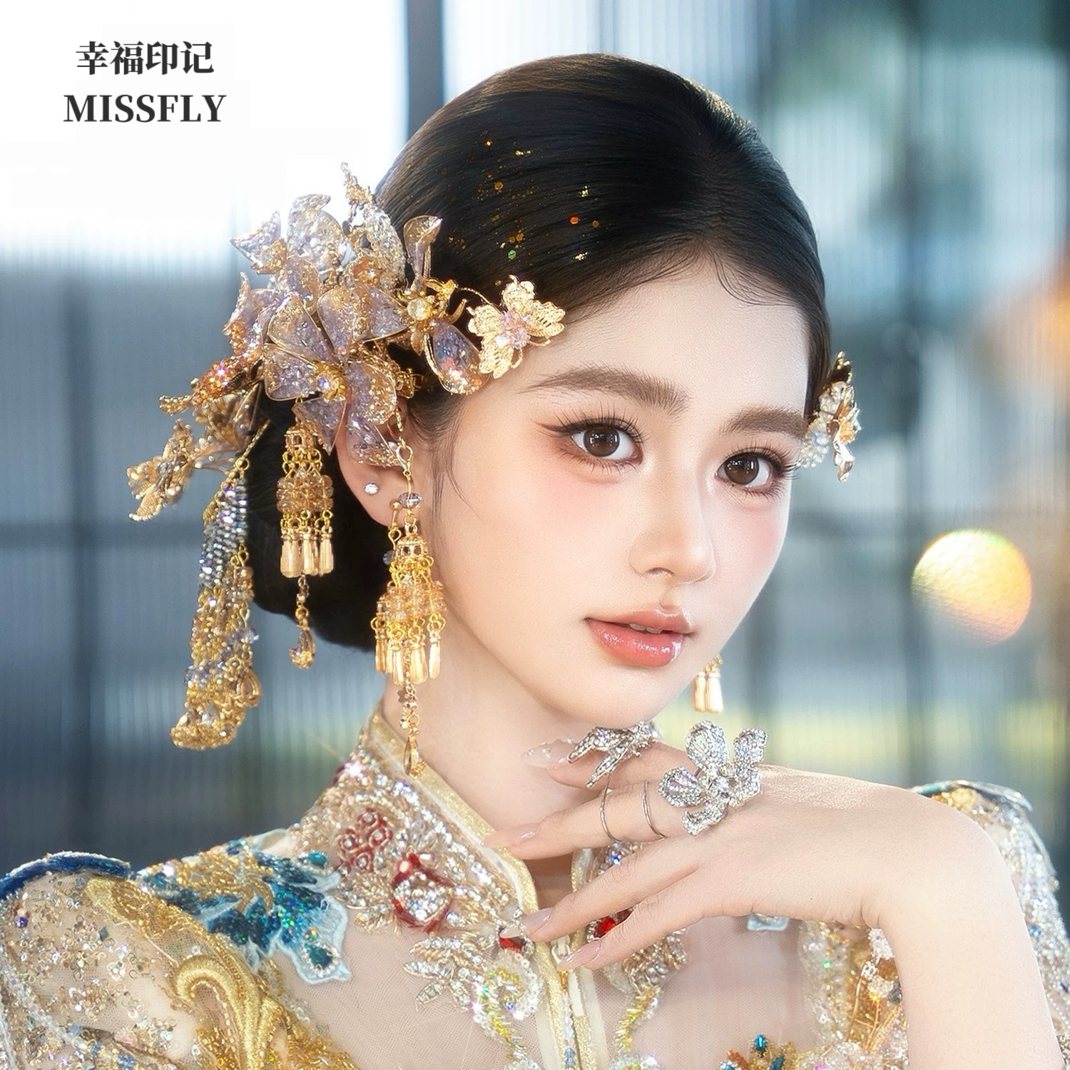 新娘龙凤褂发饰金色花朵流苏款简约大气气质手工古风古装头饰套装
