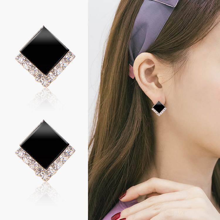 S925纯银小耳钉女百搭气质简约黑色方块耳环几何菱形长款耳坠耳夹