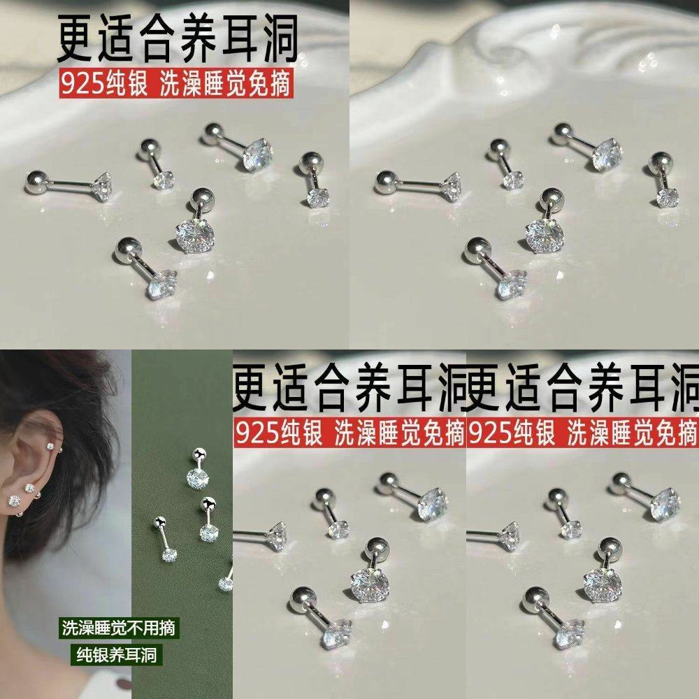 养耳洞S925纯银小耳钉螺丝拧扣螺旋耳骨钉防过敏耳钉闪钻爆闪百搭