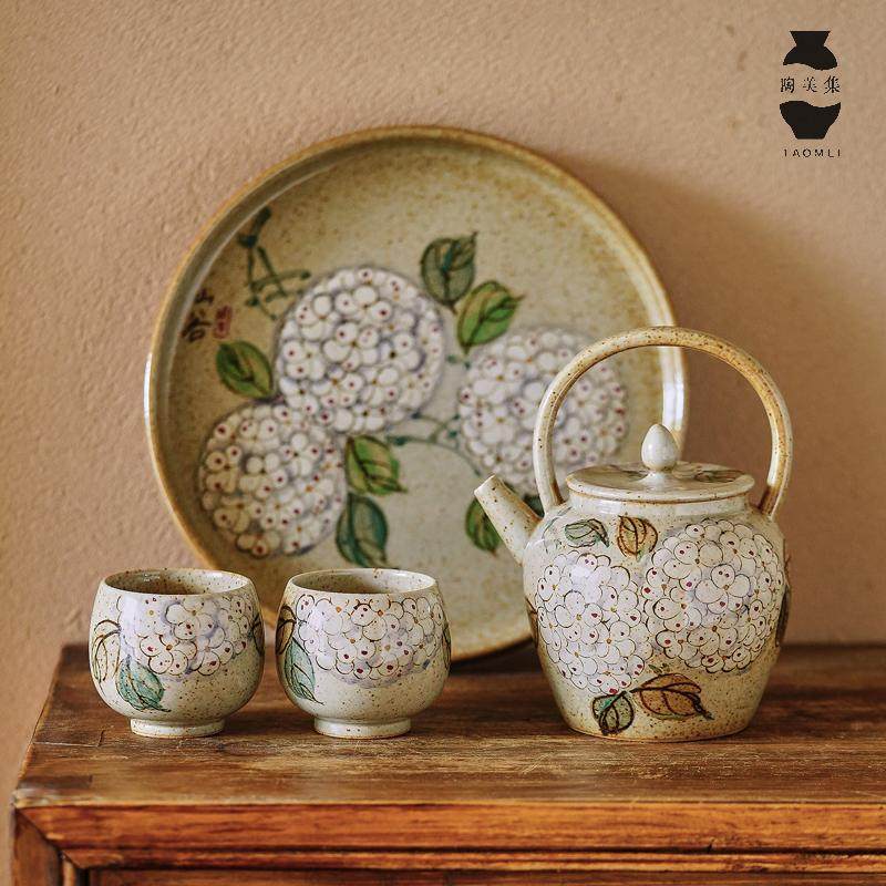 陶美集全手工粗陶茶具套装手绘绣球花茶壶泡茶家用茶杯主人杯单杯