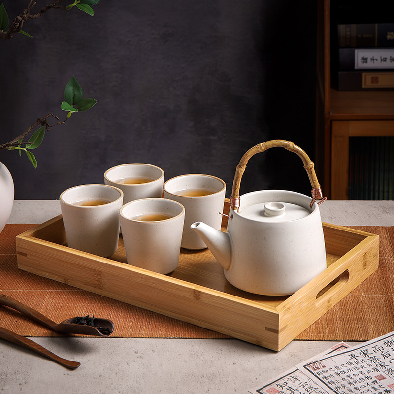 日式粗陶茶具套装复古陶瓷水壶大容量家用提梁茶壶茶杯带茶漏托盘