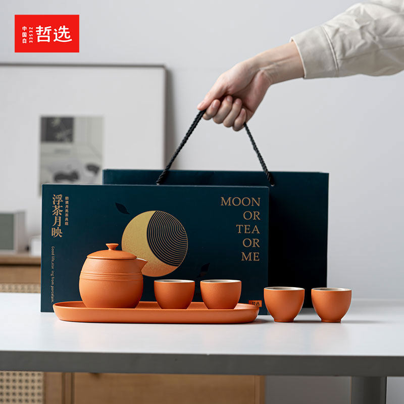 哲选 浮茶月映功夫茶具轻奢礼盒粗陶茶具套装家用泡茶壶中秋送礼