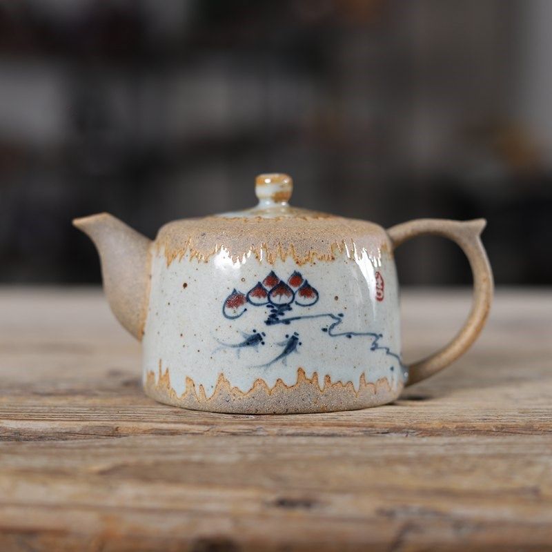 觅己手绘老岩泥盖碗柴烧茶具套装一人茶杯高档粗陶手抓壶复古茶碗