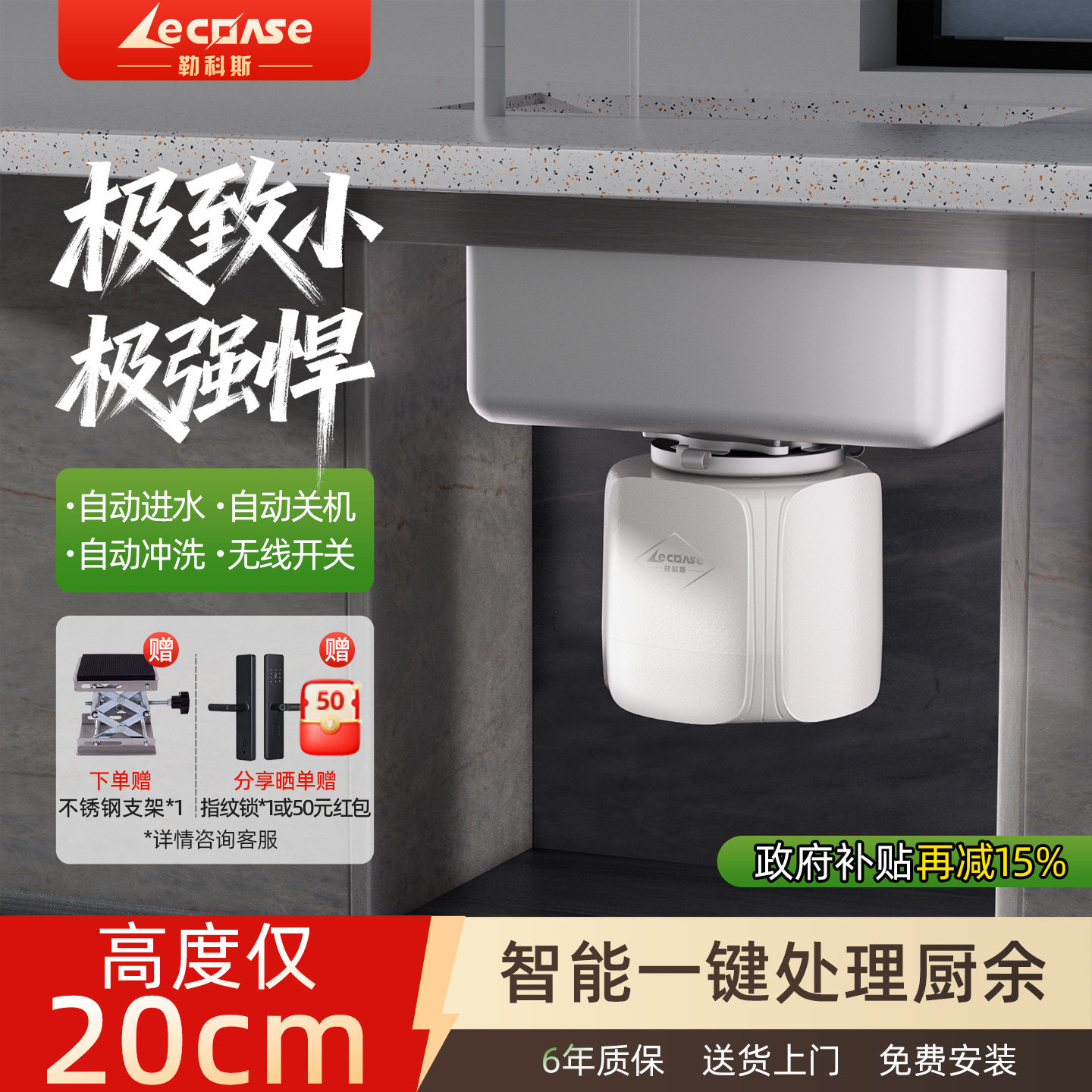 勒科斯F500垃圾处理器厨房家用厨余粉碎机水槽自动进水小型迷你