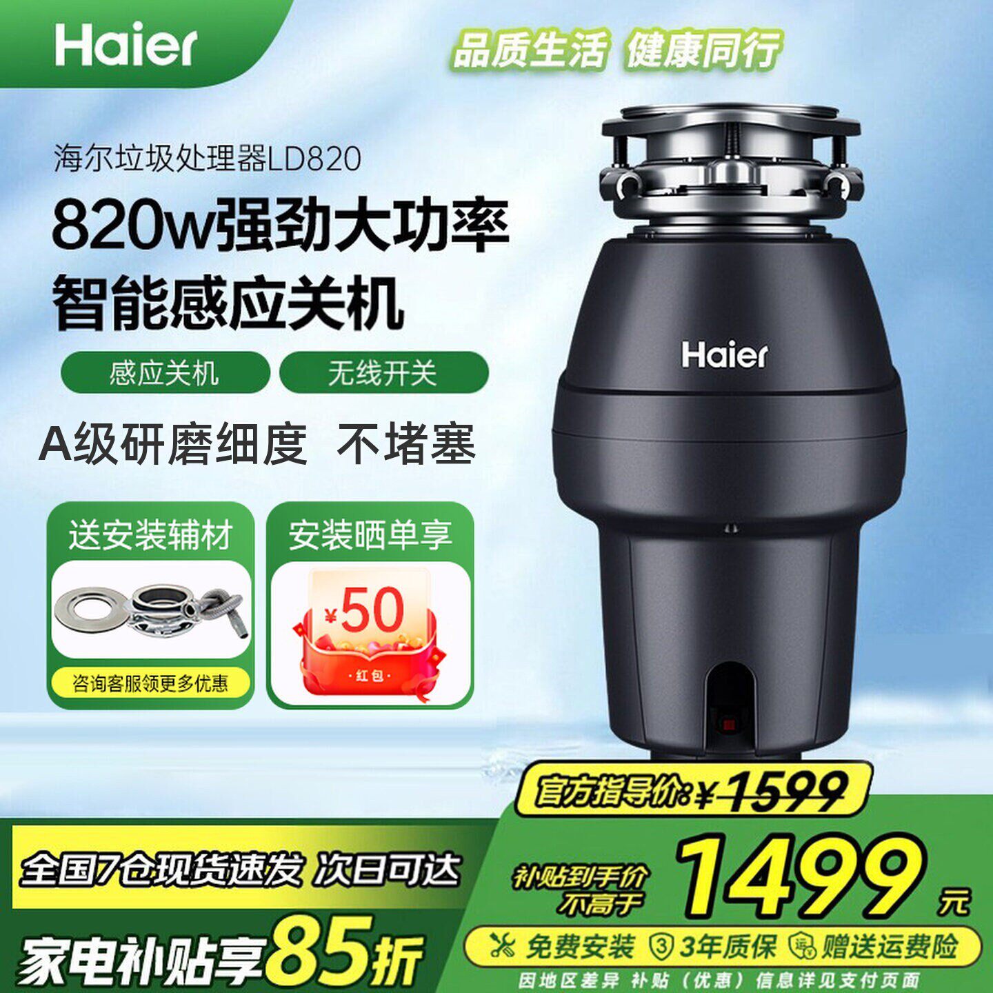 海尔LD820垃圾处理器厨房家用智能关机立体研磨厨余粉碎机大功率