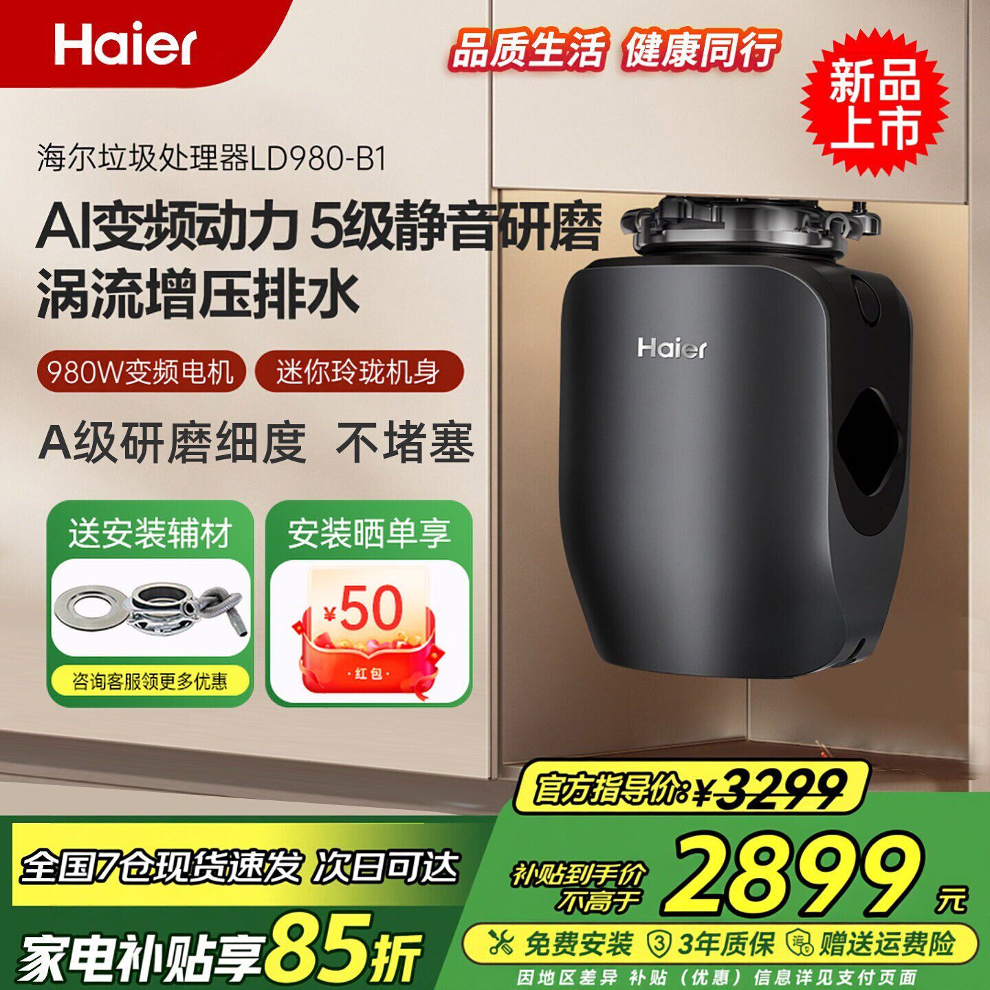 海尔LD980厨余垃圾处理器轻音研磨厨房家用研磨餐厨粉碎机厨余机