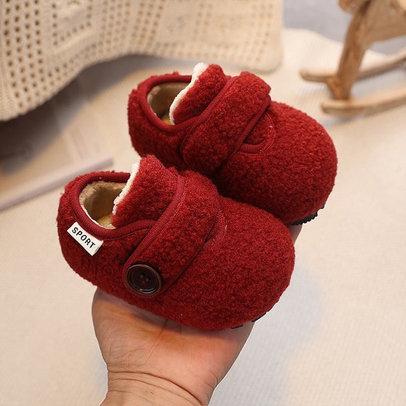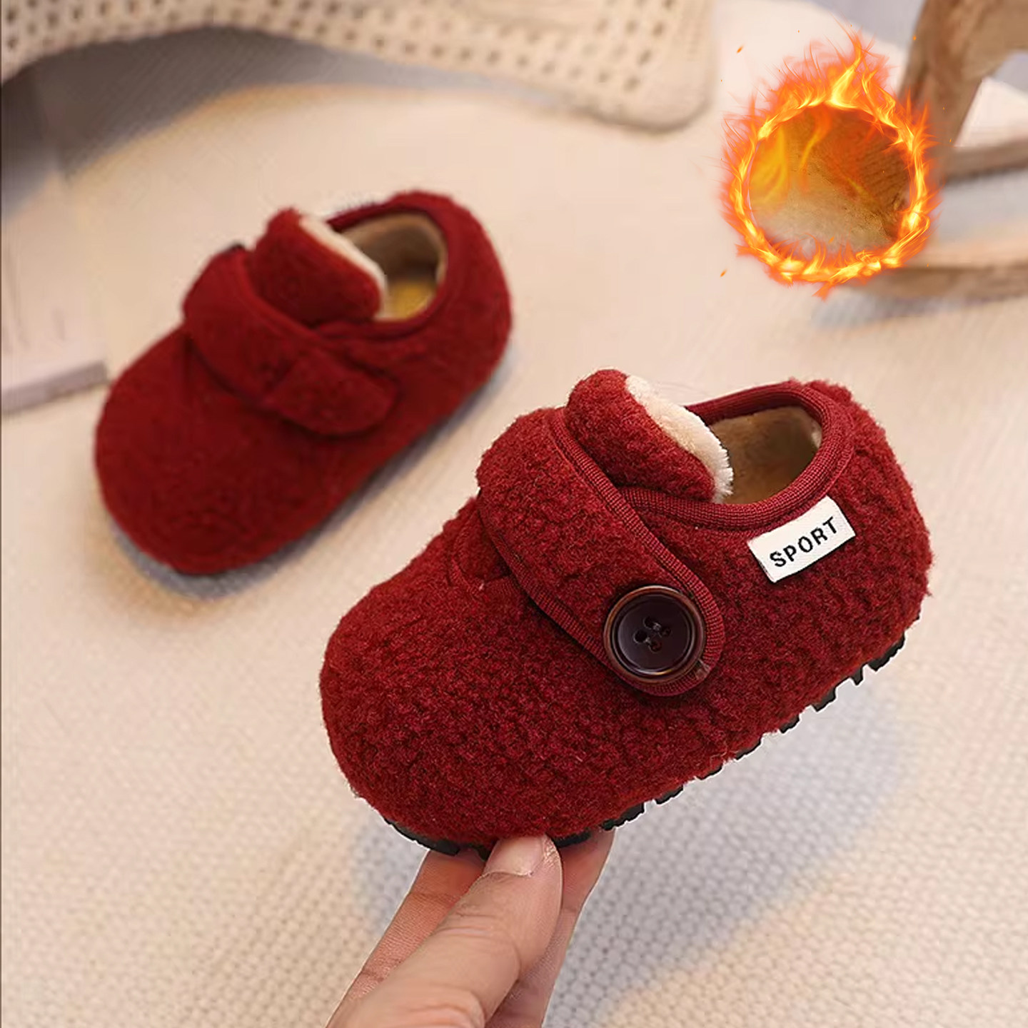 宝宝红色毛毛鞋冬季款小女孩婴幼童学步鞋加绒保暖棉鞋豆豆鞋男童