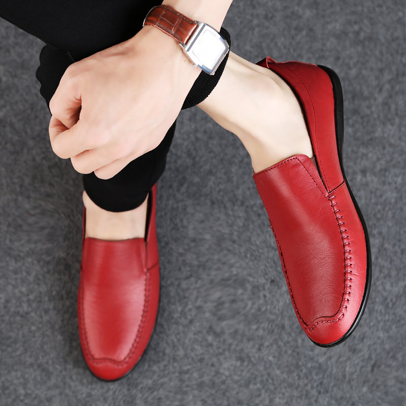 欧洲站软牛皮红色男鞋夏季潮鞋真皮豆豆鞋男士休闲板鞋软底皮鞋男