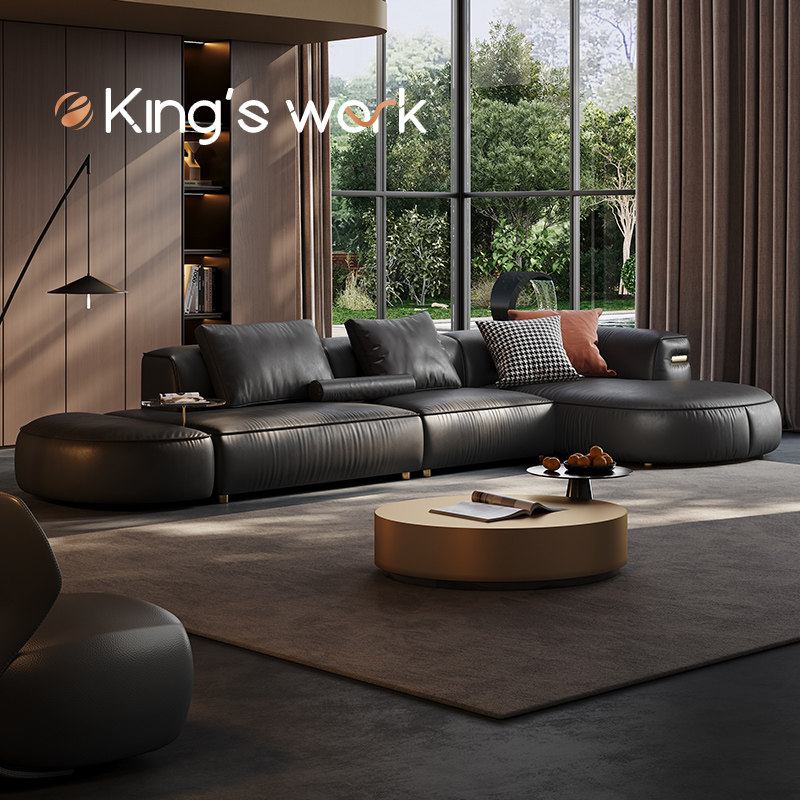 意式轻奢大黑牛转角组合头层真牛皮沙发高端别墅大气横客厅现代风