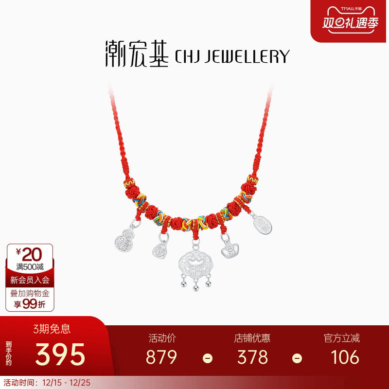 潮宏基好事发生宝护s925银项链银饰长命锁包宝宝项圈周岁满月礼物