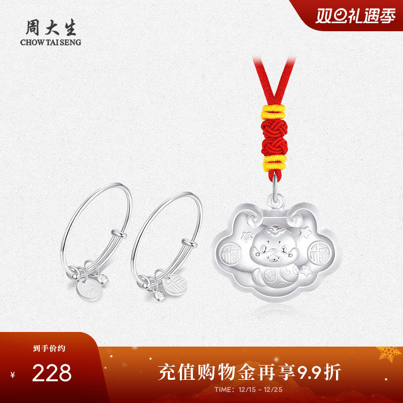 周大生婴儿纯银手镯宝宝足银镯子长命锁生肖龙蛇兔平安锁满月套装