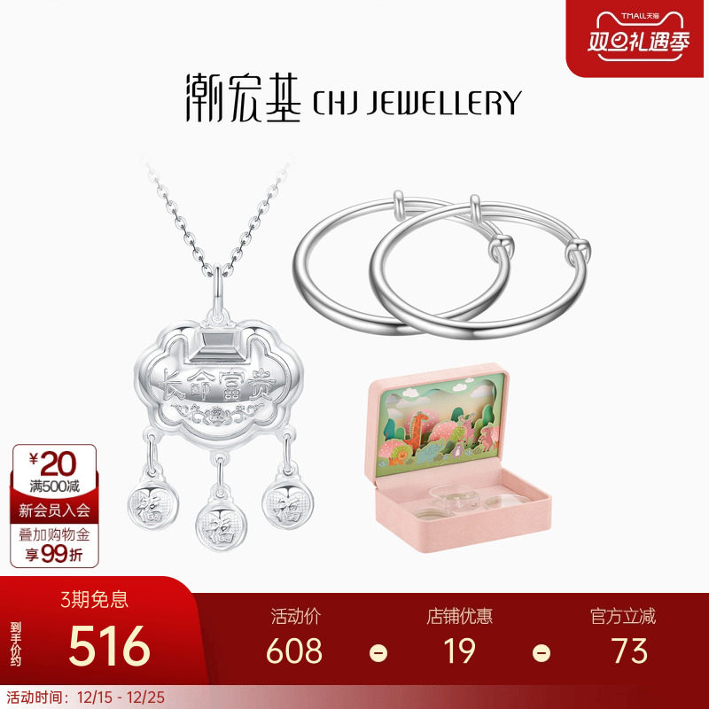 【组合】潮宏基足银套装礼盒长命锁吊坠童镯对镯宝宝周岁满月银镯
