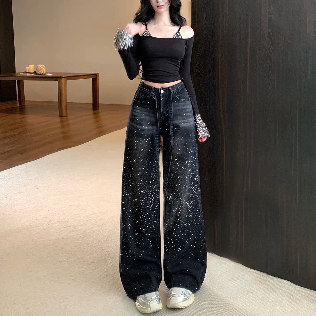 碎落星河重工烫钻阔腿牛仔裤女2026春季新款高腰宽松显瘦堆堆长裤