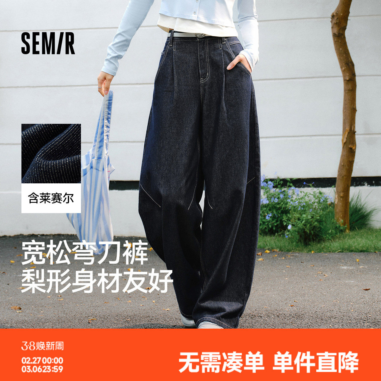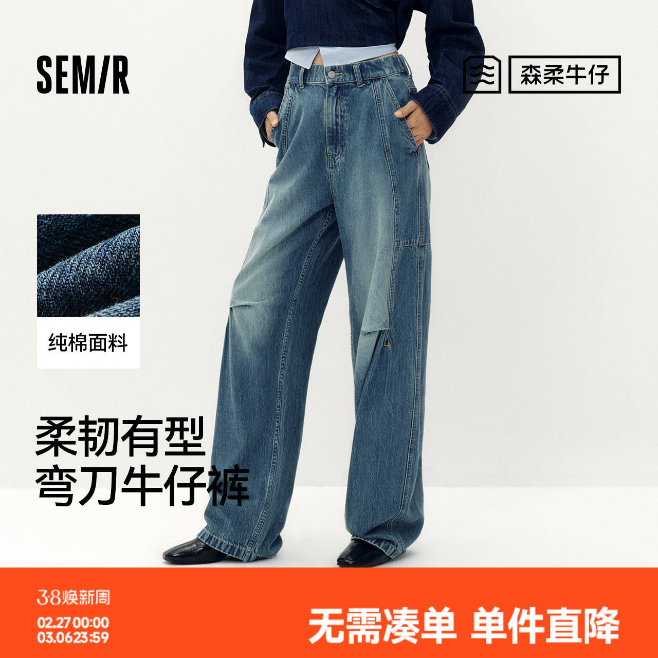 SMEN诗萌高腰弯刀裤女2026宽松显瘦阔腿裤长裤遮肉气质通勤牛仔裤