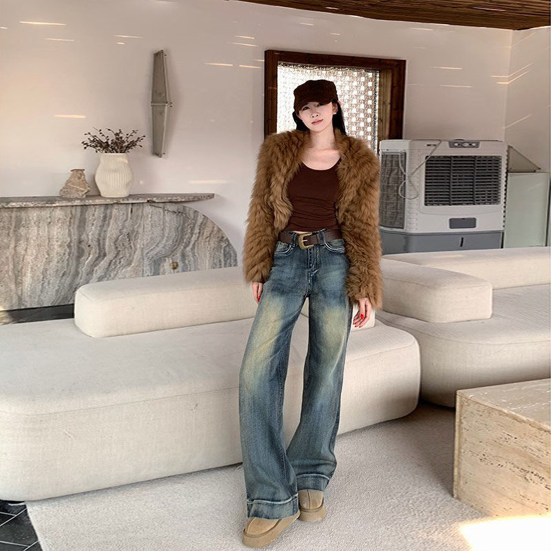 a02宽松直筒锈染做旧加绒牛仔裤女2025新款冬季加厚保暖阔腿长裤