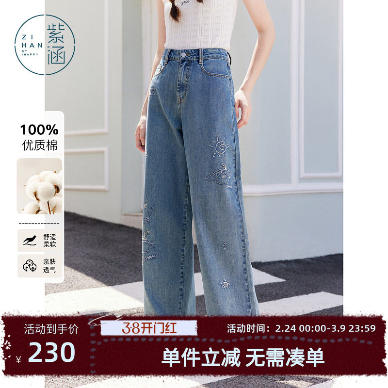 紫涵蓝色直筒阔腿牛仔长裤女秋季新款高腰宽松卡通刺绣设计休闲裤