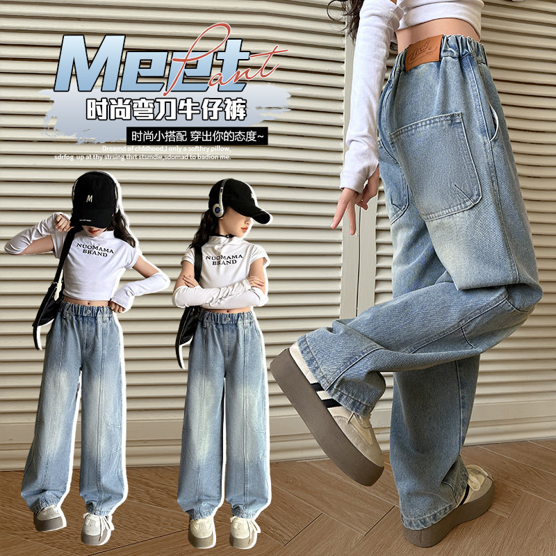 时尚宽松牛仔裤女长裤浅蓝色直筒裤休闲百搭裤子春秋中大童松紧腰