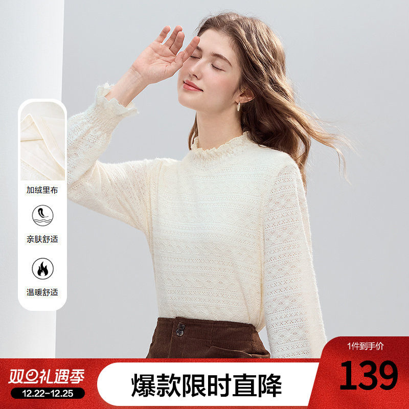 betu百图法式木耳边加绒衬衫女2025年冬季新款半高领衬衣打底衫