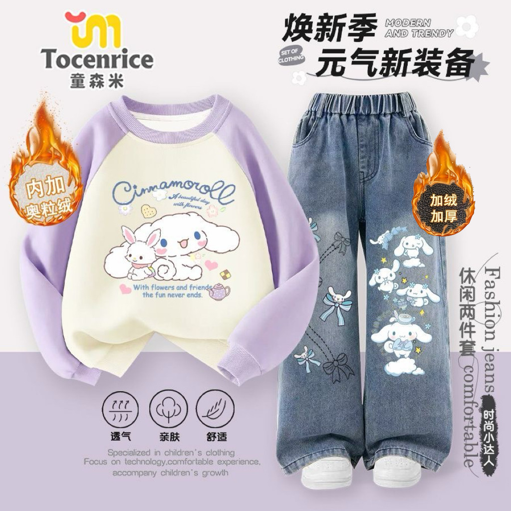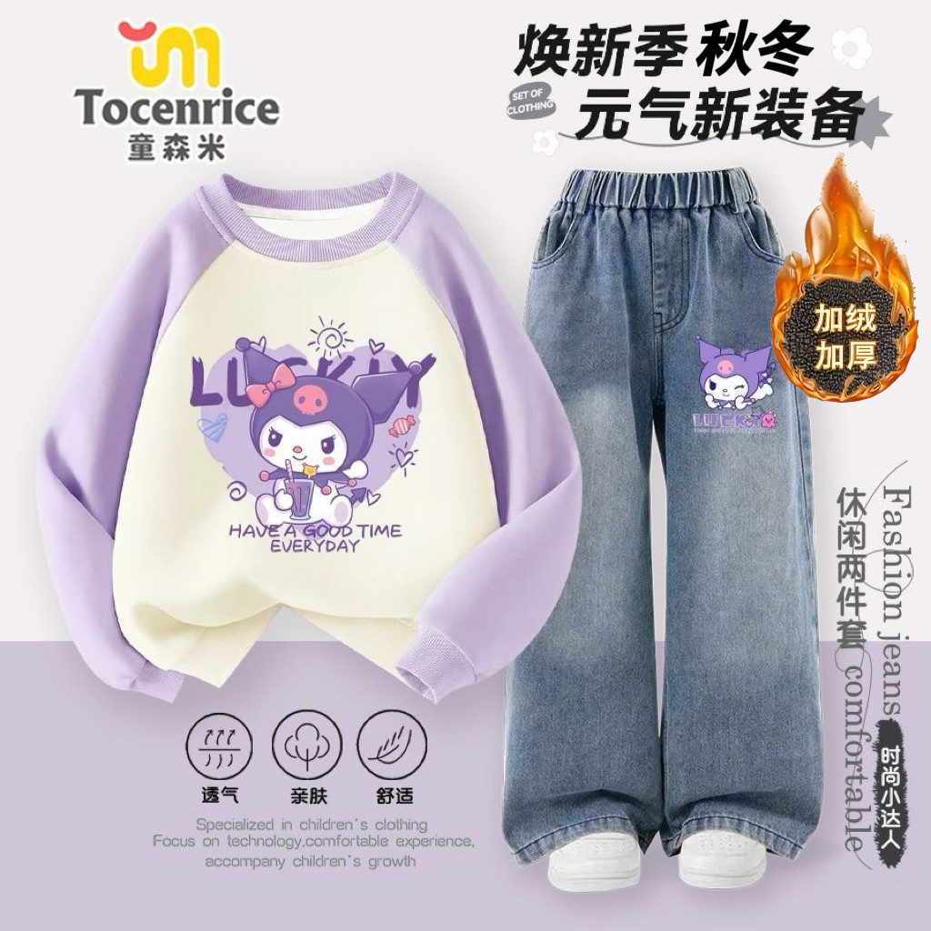 库洛米女童套装秋冬2025新款中大童女孩卫衣加绒牛仔裤保暖两件套