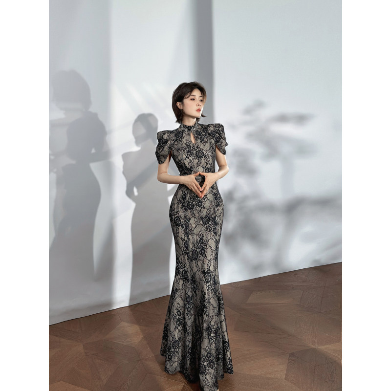 XULU原创高级镂空蕾丝复合旗袍气质高端新款公主袖收腰包臀连衣裙