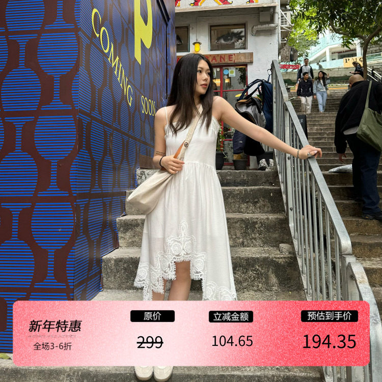 DPLAY2026年春季新款白色连衣裙蕾丝花边收腰镂空时尚吊带长裙女