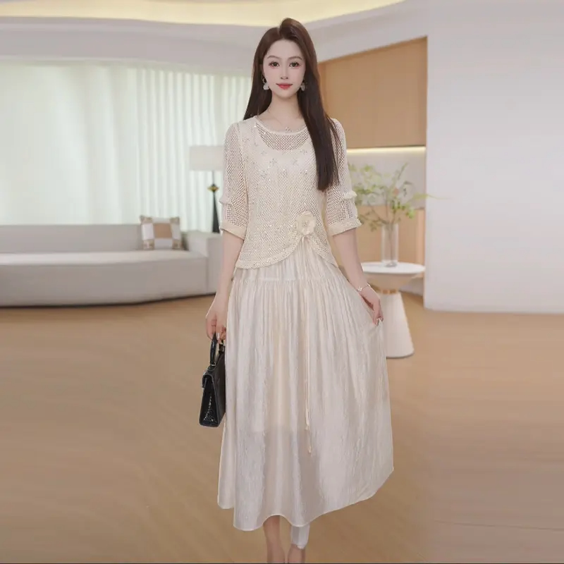 法式蕾丝镂空罩衫+连衣裙女长裙米白色高级感显瘦时尚气质两件套