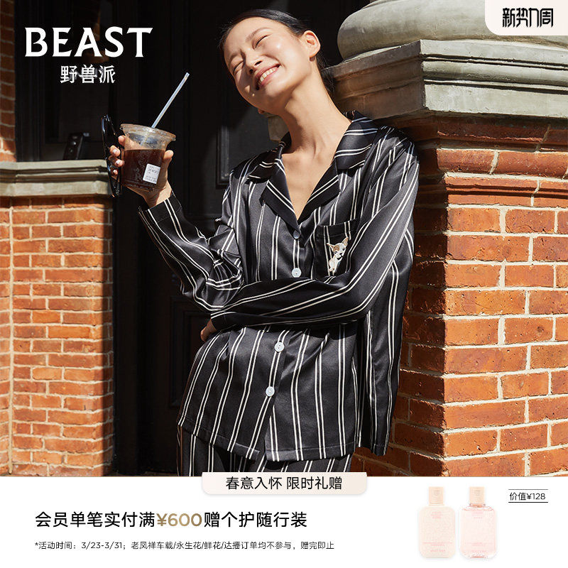 查理小狗』桑罗条纹印花桑蚕丝睡衣套装女娃娃领长袖家居服可外穿