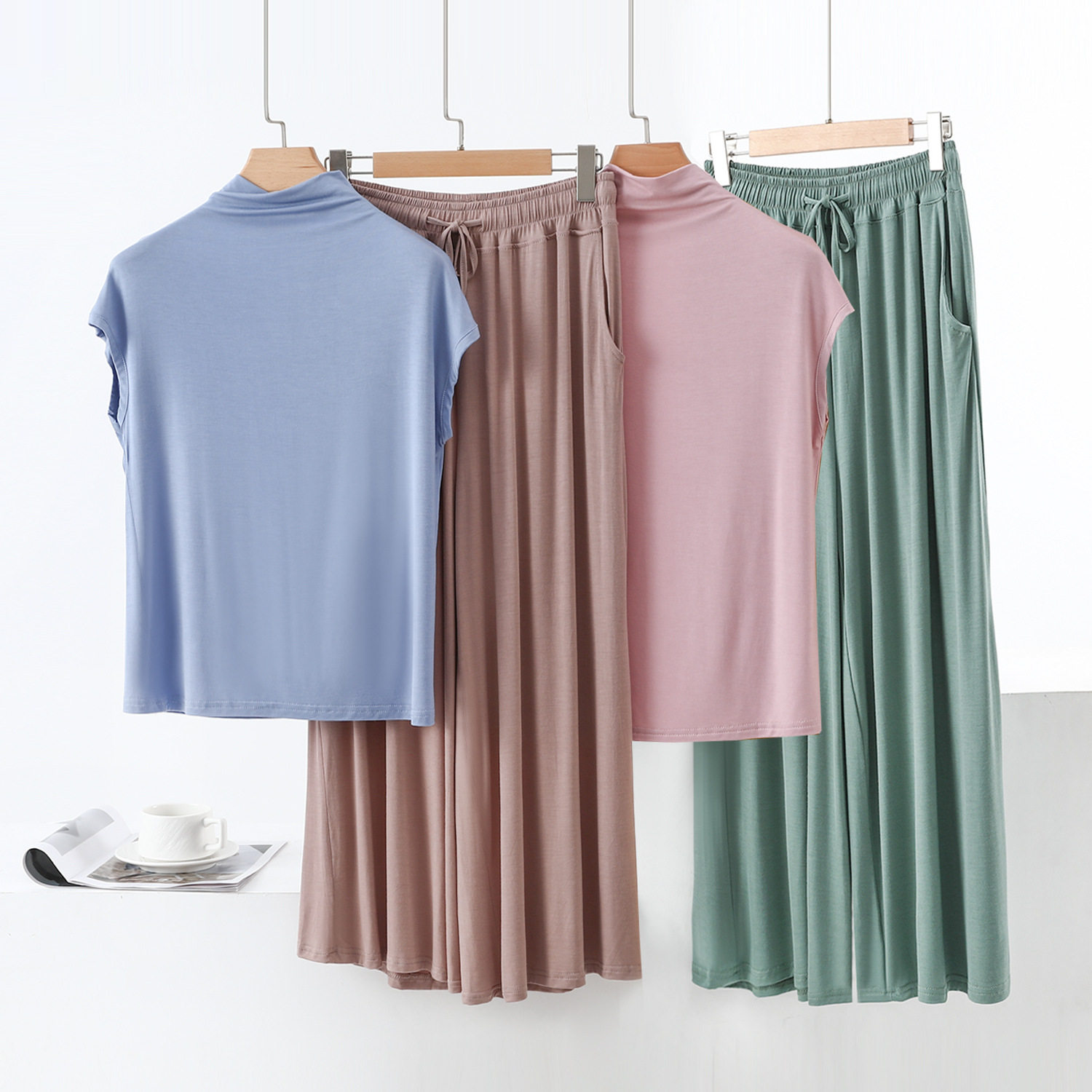 夏季款莫代尔半高领无袖打底衫拼色口袋阔腿裤休闲简约百搭两件套