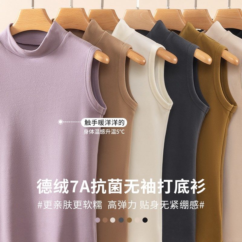 德绒半高领无袖打底衫女外穿秋冬季保暖内搭加绒加厚背心弹力上衣