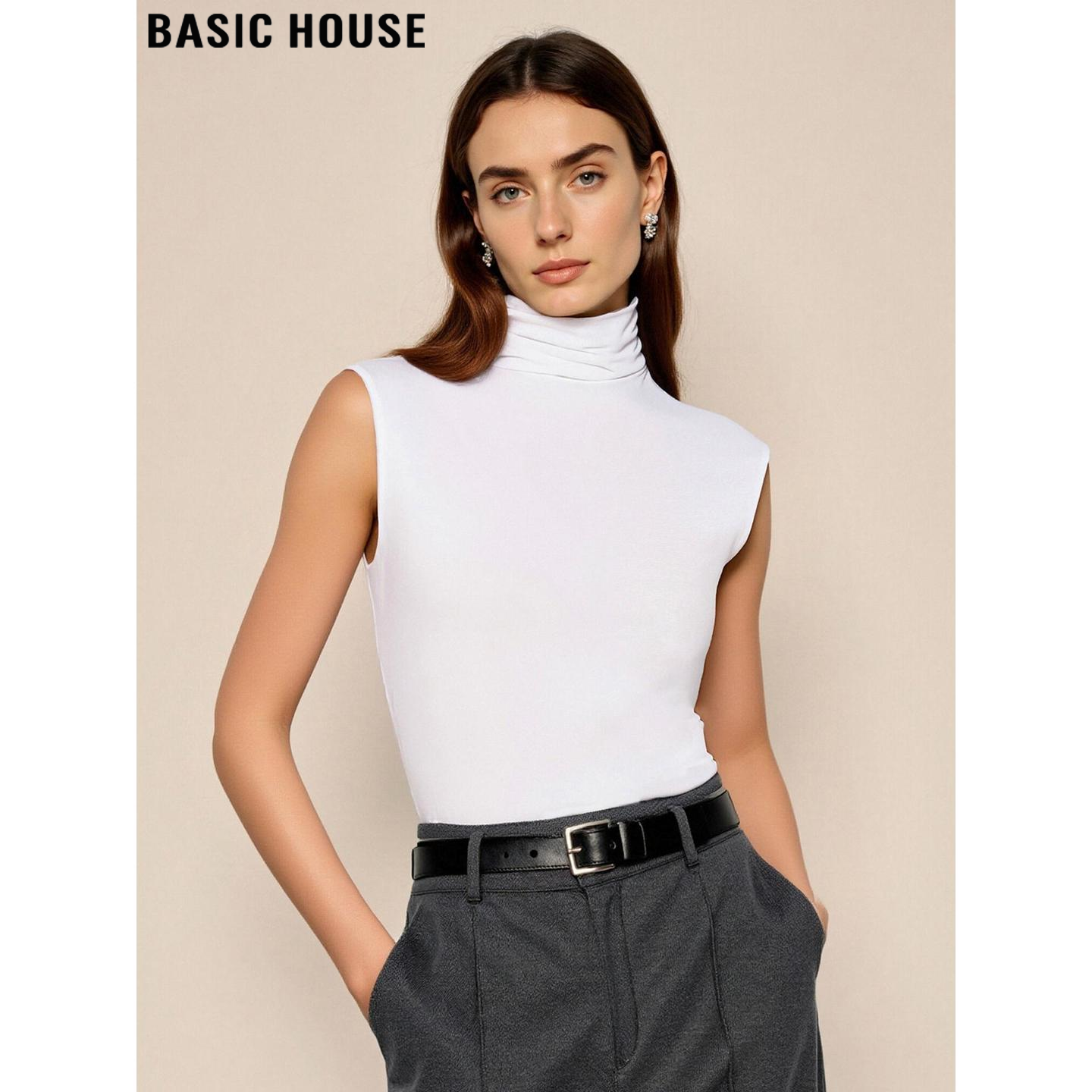Basic House/百家好白色高领无袖打底衫女士春季内搭修身坎肩T恤