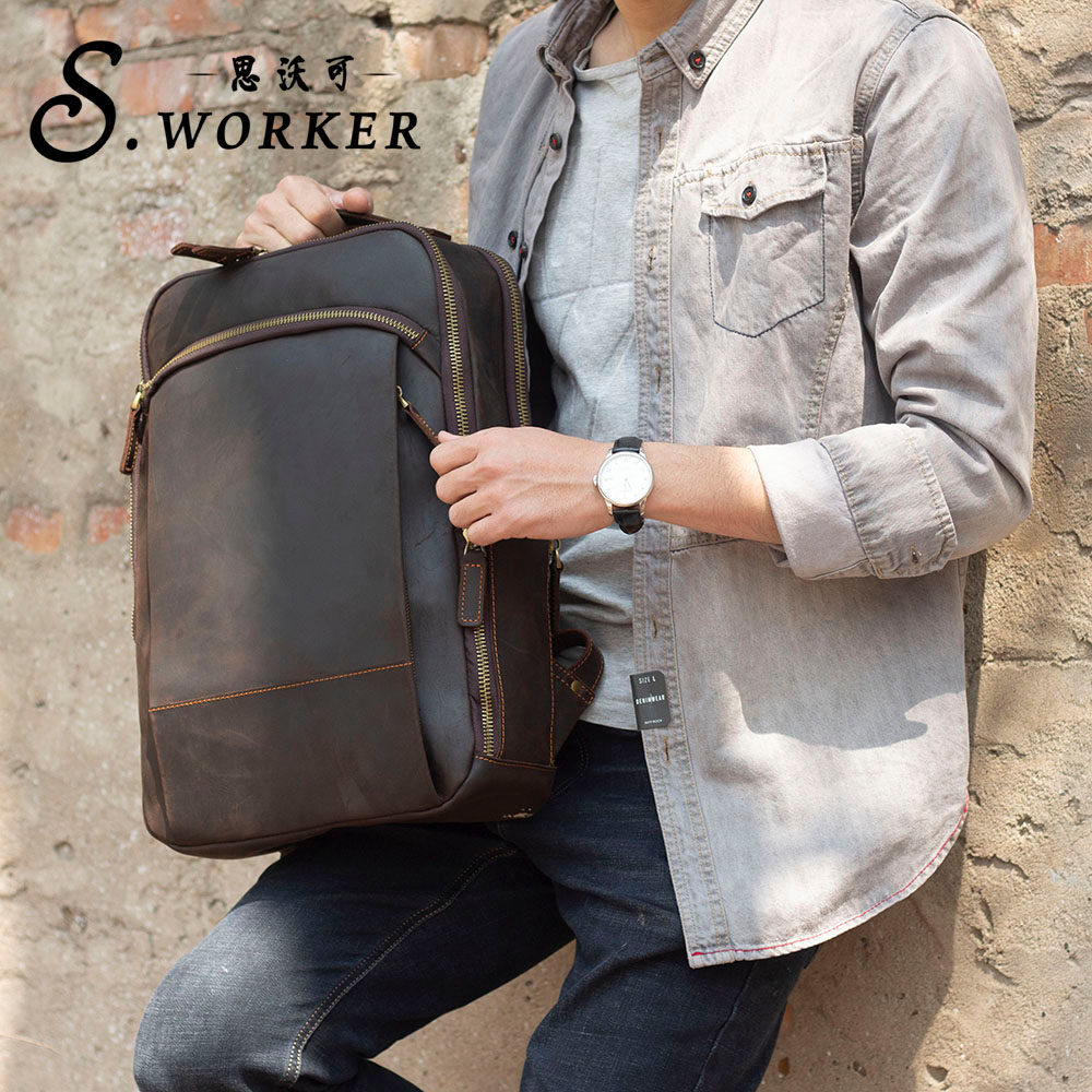慢时光欧美手工旅行真皮双肩包男商务休闲头层牛皮背包18寸电脑包