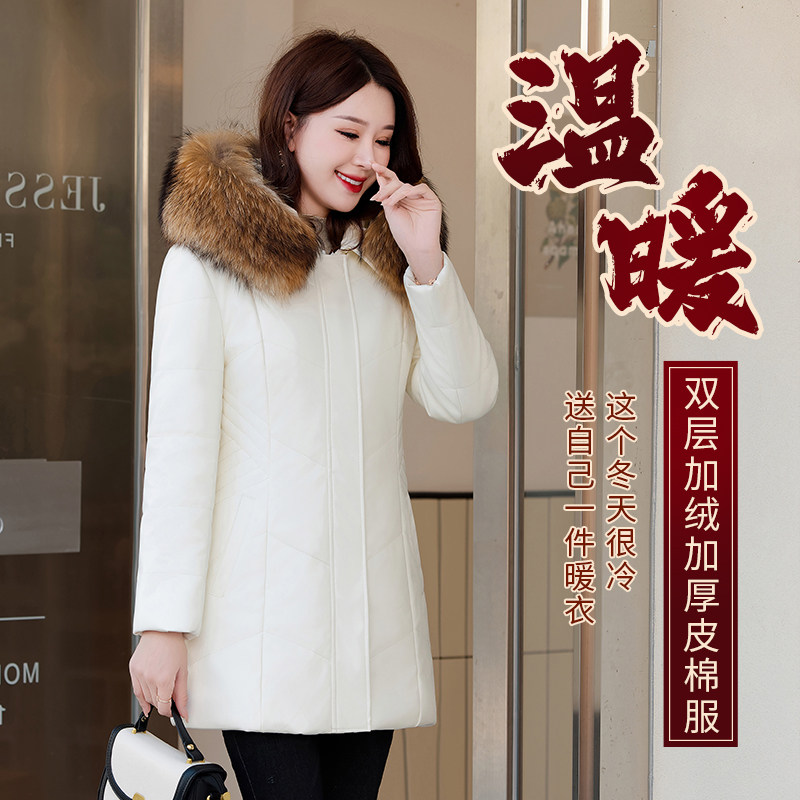 冬加绒加厚皮衣棉服女中长款妈妈装棉衣加肥加大码中年皮棉袄外套