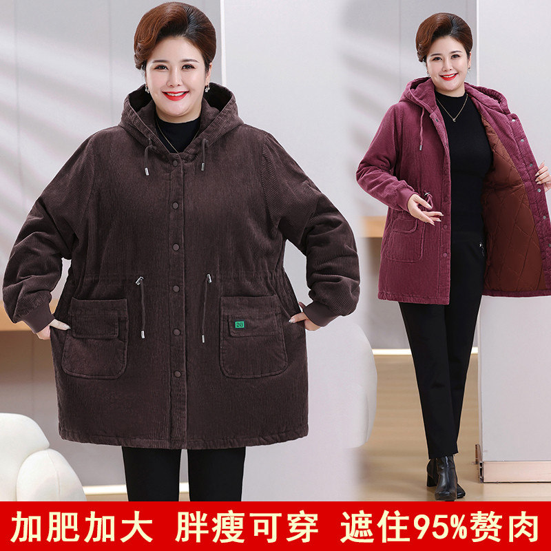 加肥加大冬季纯棉条绒加棉外套胖妈妈保暖舒适棉袄中长款休闲外套