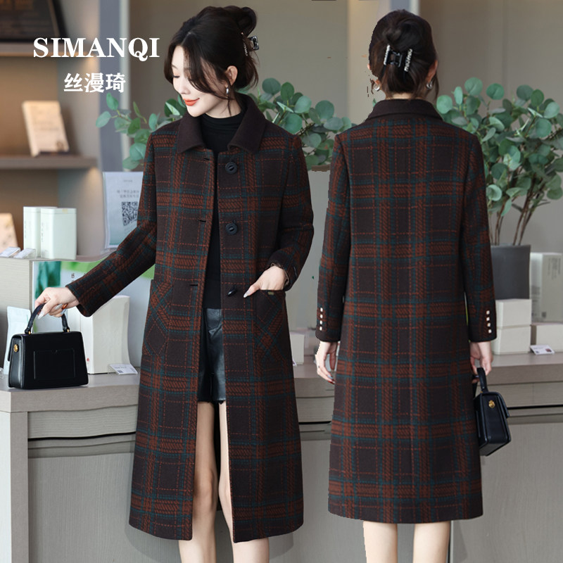 加绒中年妈妈毛呢外套加厚女中长款中老年呢子大衣洋气呢大衣格子
