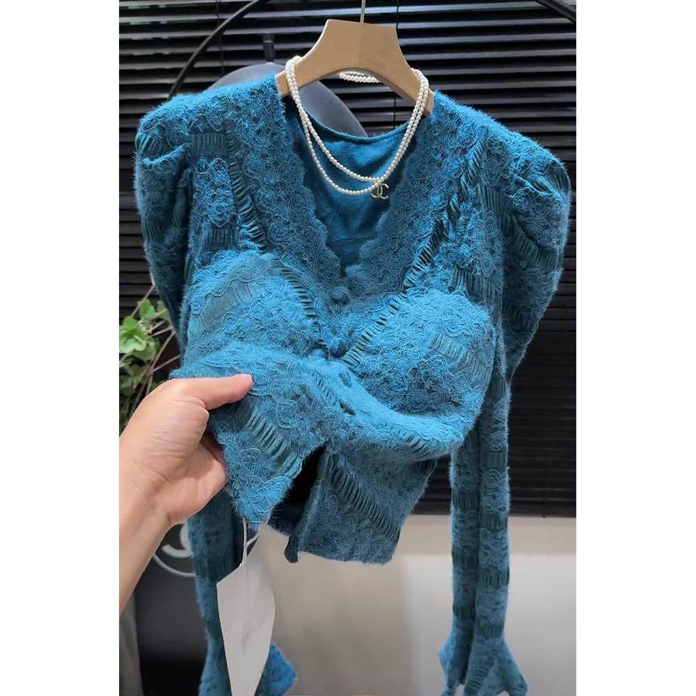 欧洲站2025冬季新款V+.COM设计感V领加绒蕾丝衫女喇叭袖修身上衣