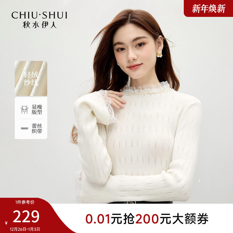 秋水伊人优雅蕾丝领上衣2025年冬季新款女温柔甜美喇叭袖毛针织衫