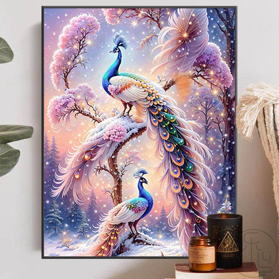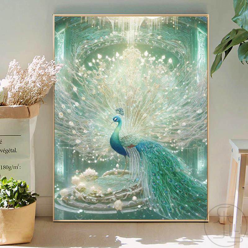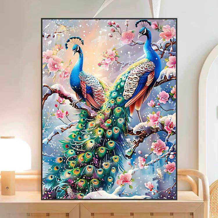 雪中孔雀5d钻石画 画2024新款手工十字绣满钻客厅粘点砖贴画 画玄